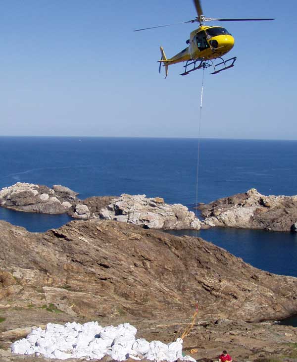 Por un lado, se realizó la deconstrucción manual del faro sónico para evitar la dispersión del material y para el control exhaustivo del procedimiento. El material obtenido de la deconstrucción se depositó en big bags, retiradas en helicóptero y llevadas a un punto intermedio donde eran cargadas en camión para su posterior transporte al vertedero controlado. En esta obra se pudo apreciar la dificultad en la extracción de los materiales adheridos a las rocas donde yacía el faro sónico. La velocidad del viento en episodio de tramontana superaba los 60-70 km/h, hecho que dificultó el trabajo.